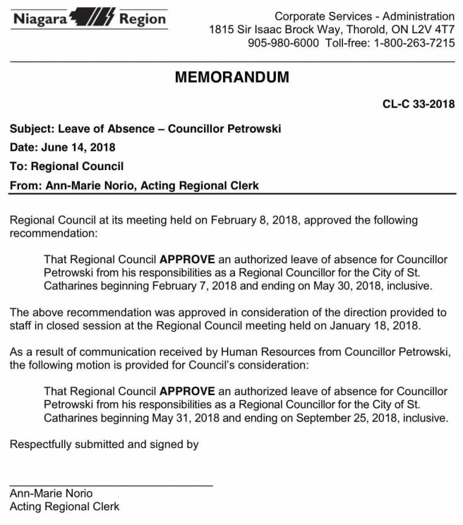 With Niagara Regional Council set to debate another extension of Councillor Petrowski’s leave of absence (and make it retroactive) at this evening’s Council meeting, there are a number of things that need to be considered, especially the piece around accountability.