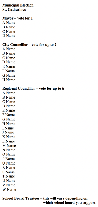 Here’s what your ballot will look like in St. Catharines, with the number of candidate names for City Councillor varying depending on the ward in which you live: