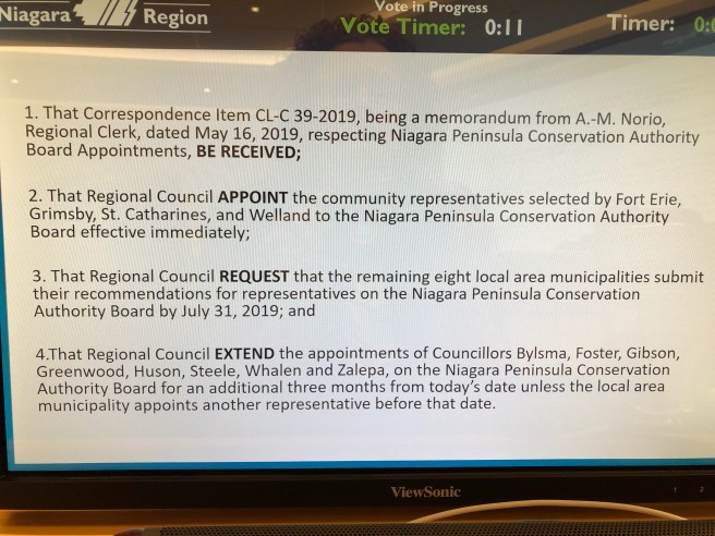 - That Regional Council EXTEND the appointments of Councillors Bylsma, Chiocchio, Foster, Gibson, Greenwood, Heit, Huson, Insinna, Jordan, Steele, Whalen and Zalepa, on the Niagara Peninsula Conservation Authority Board for an additional period of three months; and