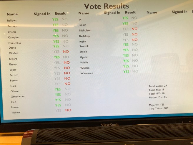 In a recorded vote, the motion failed with 25 No votes and only 5 Yes votes. Voting ‘yes’ along with me were Councillors Campion, Chiocchio, Jordan, and Villella. Chair Bradley doesn’t vote, and Councillor Sendzik was not present.