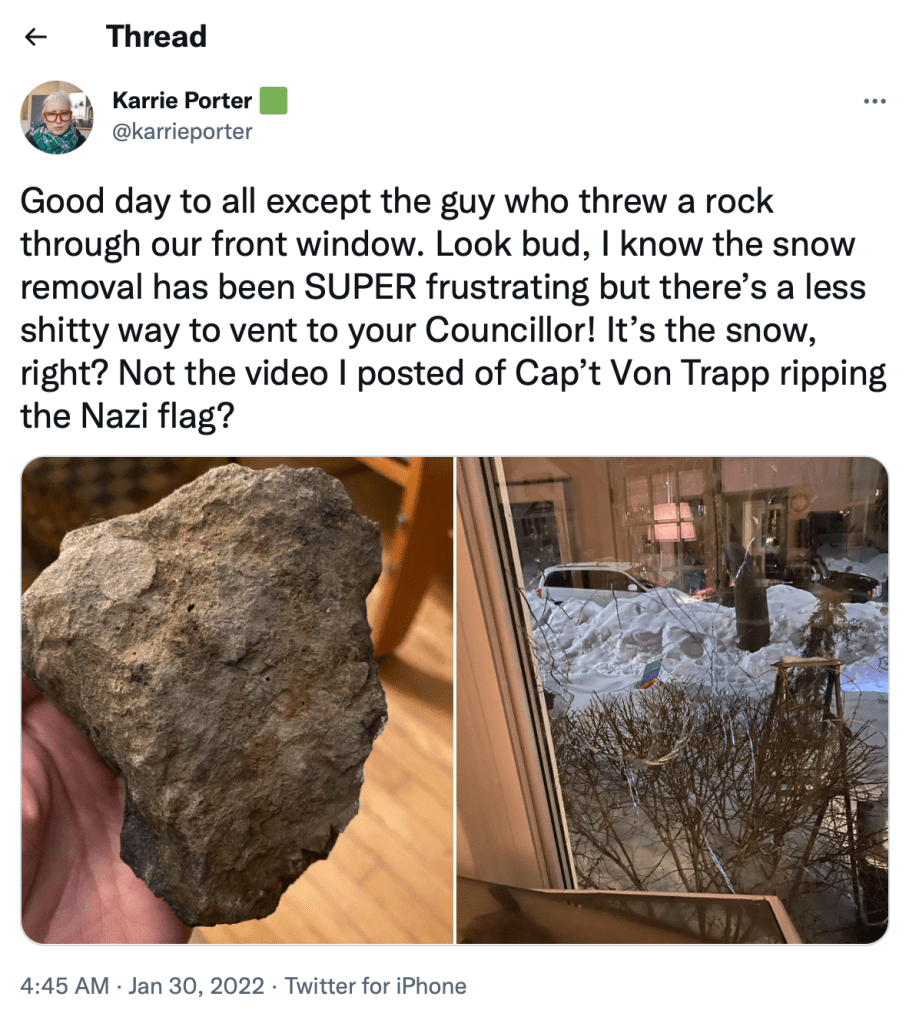 This time, it’s a rock through her front window.