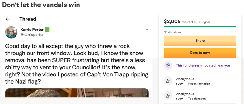 It prompted me to immediately post a fundraiser to pay for the damage, so that Karrie and her husband and children don’t have to pay for this twice. They’re already paying emotionally. They shouldn’t have to pay financially too. They shouldn’t have to make a claim against their home insurance and potentially see their premium increase (thereby, paying for the damage to some extent).