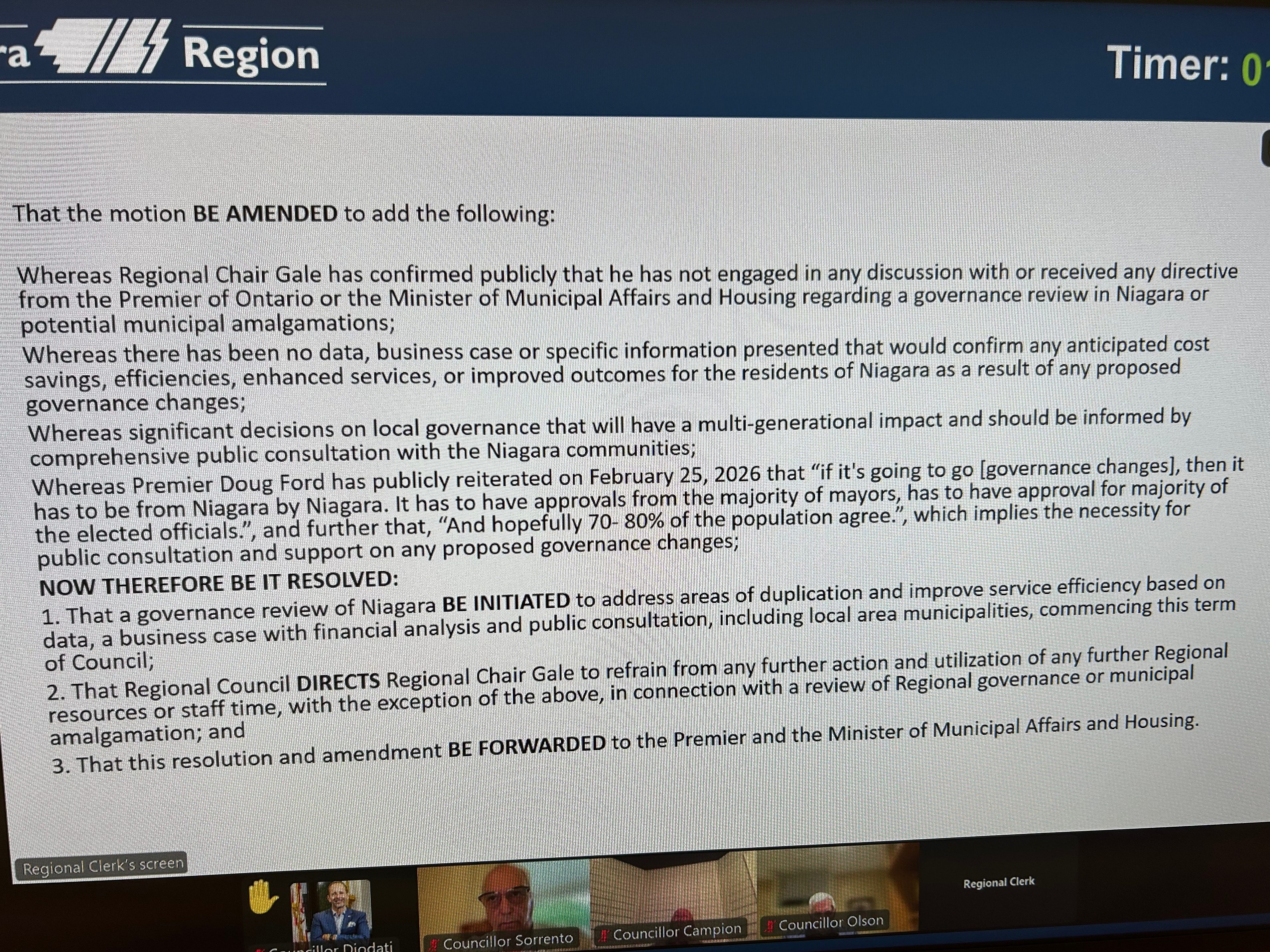 After several other directly-elected Regional Councillors said their piece about how inappropriate the Chair’s actions are (including Councillor Bateman asking a question that led to Bob Gale saying “I was instructed to”…more on that later), Councillor Redekop and I brought forward the following amendment to the motion: