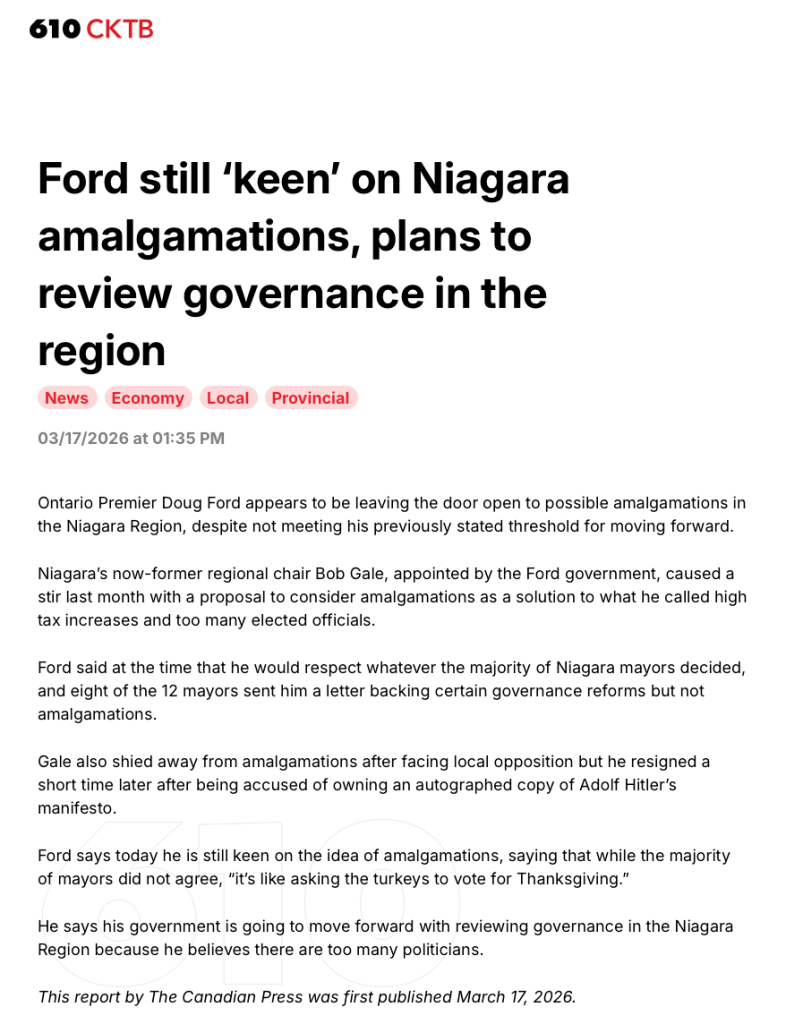 the Premier seems to have decided that it doesn’t matter what Niagara’s elected officials or residents think.